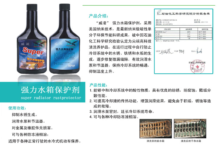 “威凌” 強力水箱保護劑,是美國納米技術,最新納米級磁性單分子環保節能科研成果,被中國石油化工科學研究檢驗認定為尖端高科技清洗養護品,在運行過程中自行防止冷卻系統中的水銹、鐵銹和水垢的生成,逐步修復微漏縫隙,有效潤滑水泵和節溫器,保持冷卻系統的暢通,抑制溫度上升。
